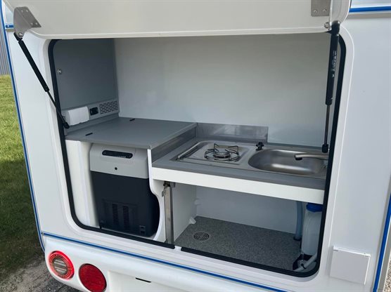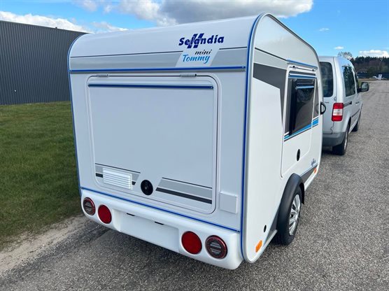 Mini campingvogn i et veludført design. Tommy er udført i et strømlinet design, der sikrer nem kørsel på vejen. Vognen er udstyret med gode opbevarings muligheder både inde i vognen, men også bag i rummet til opbevaring. Den 2 delte madras kan foldes, så man kan sidde i campingvognen og bordplader er monteret under den forreste madras. Vognen er nem at få Tempo 100 godkendt. Tommy De-luxe er kompakt lille mini camper, der er udstyret med musikanlæg og et mini køkken bag med gaskomfur, mini køleskab samt håndvask.