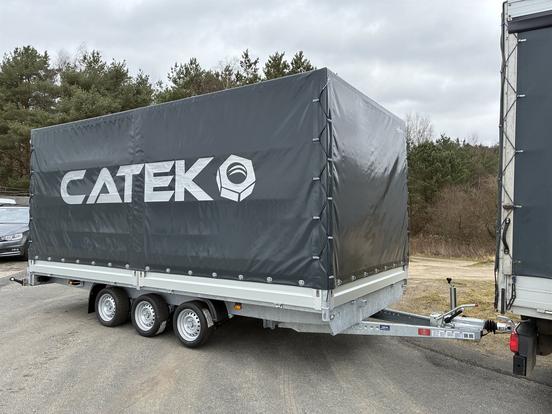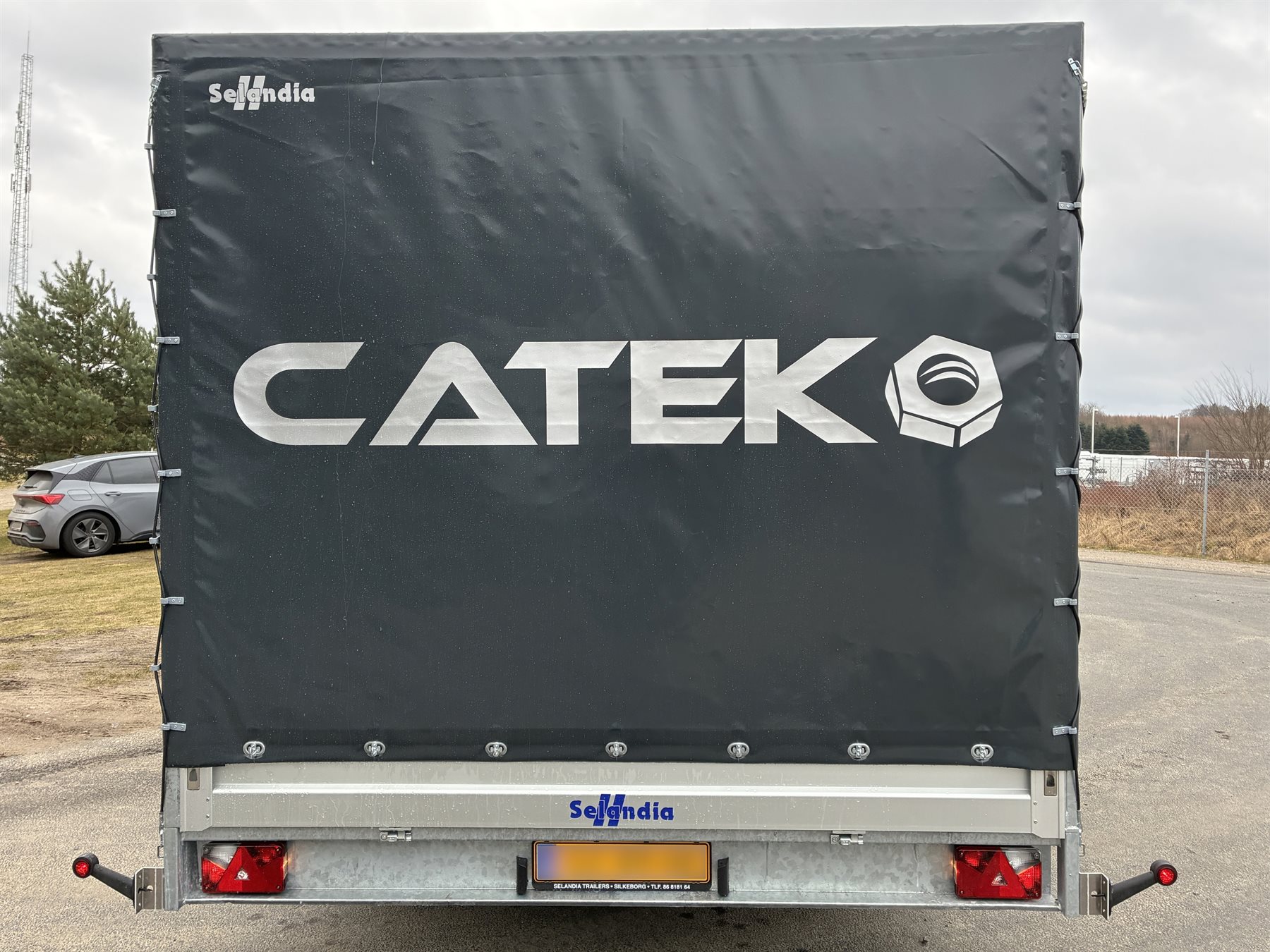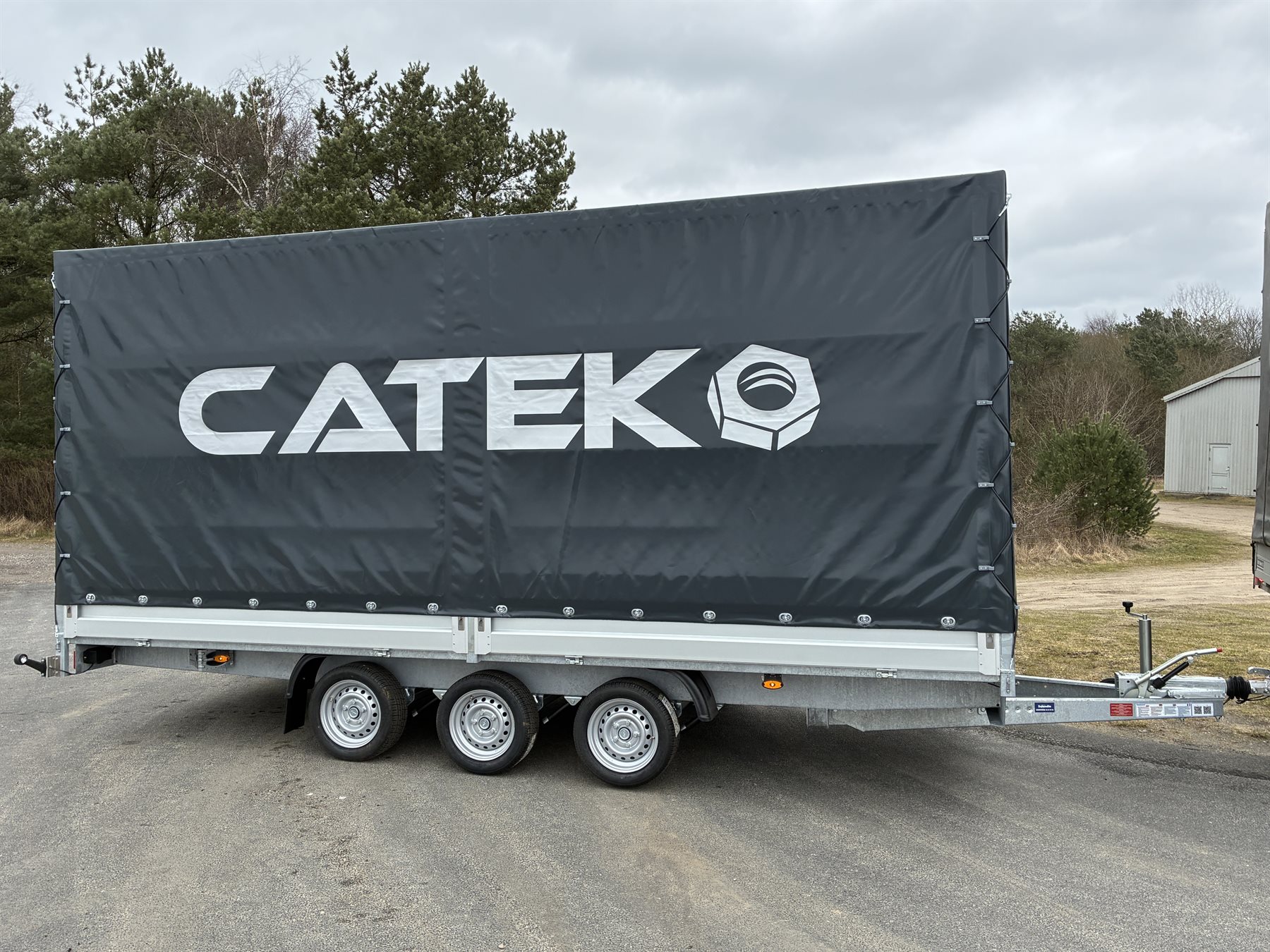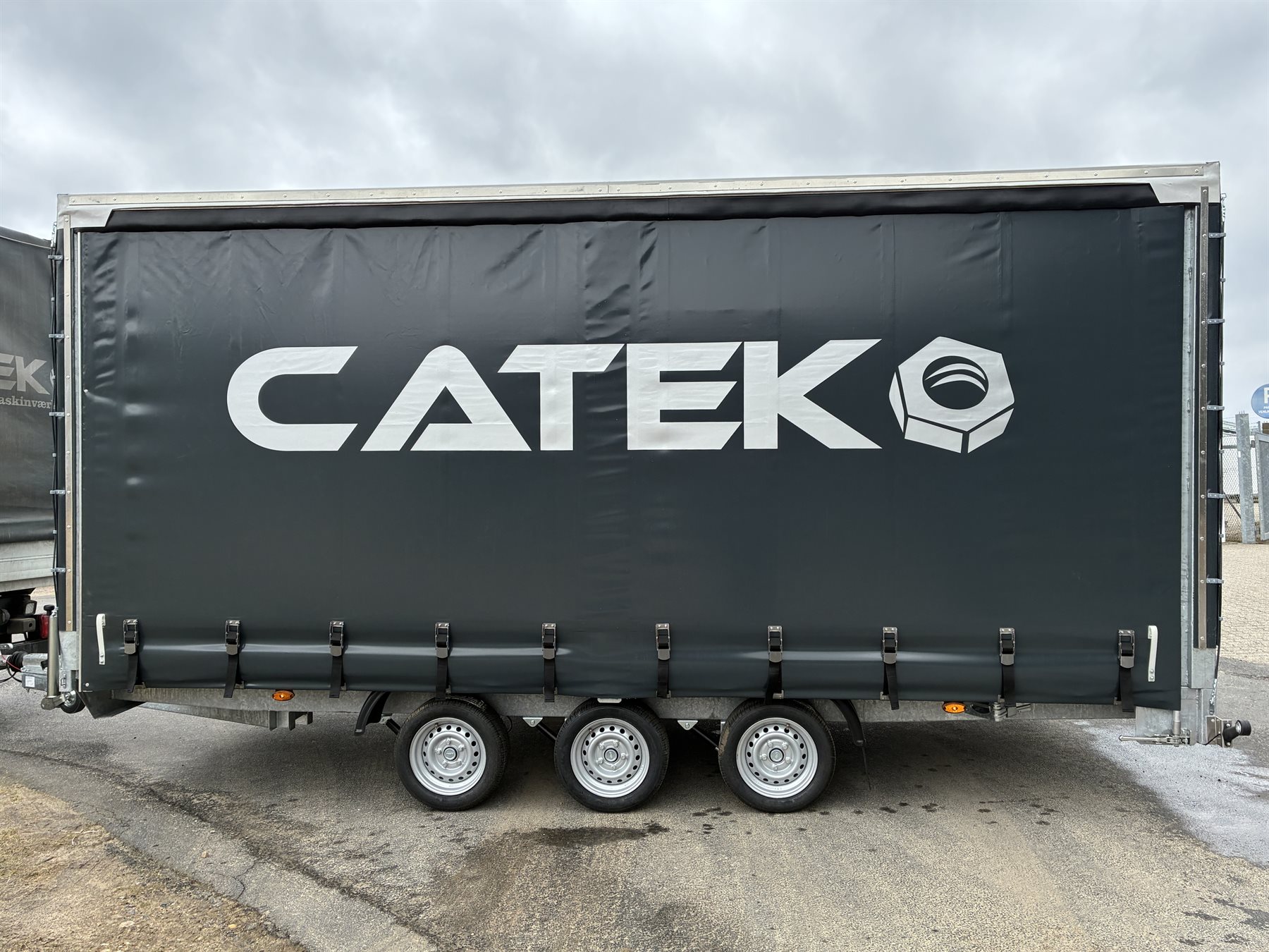 Trailerens høje presenning er blevet specialsyet i en grå farve med en specifik farvekode, som matcher CATEK og deres udtryk. Derudover har traileren fået påsat folie med CATEK’s logo på både bagsiden og siderne, og den er udstyret med skydepresenning i venstre side.