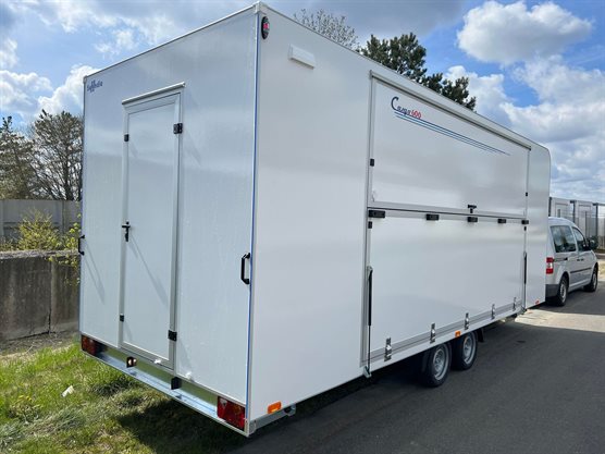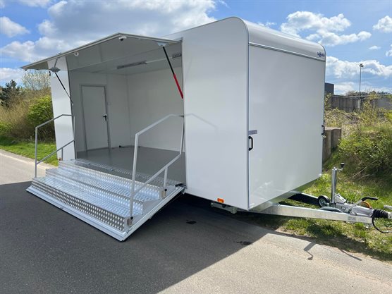 TP 600 udstillingsvogn er en eksklusiv strømlinet mobil showroom løsning, som har mange anvendelsesmuligheder. Den er ideel til deltagelse på messer, markeder og andre former for turné, som kræver et mobilt showroom, der let kan flyttes fra sted til sted. Vognen er nem at betjene og kan hurtigt gøres klar til brug ved at åbne den 2-delte klap i vognens ene langside så der dannes en fin indgang til vognen for kunder via bredt indgangsparti med gelænder.
